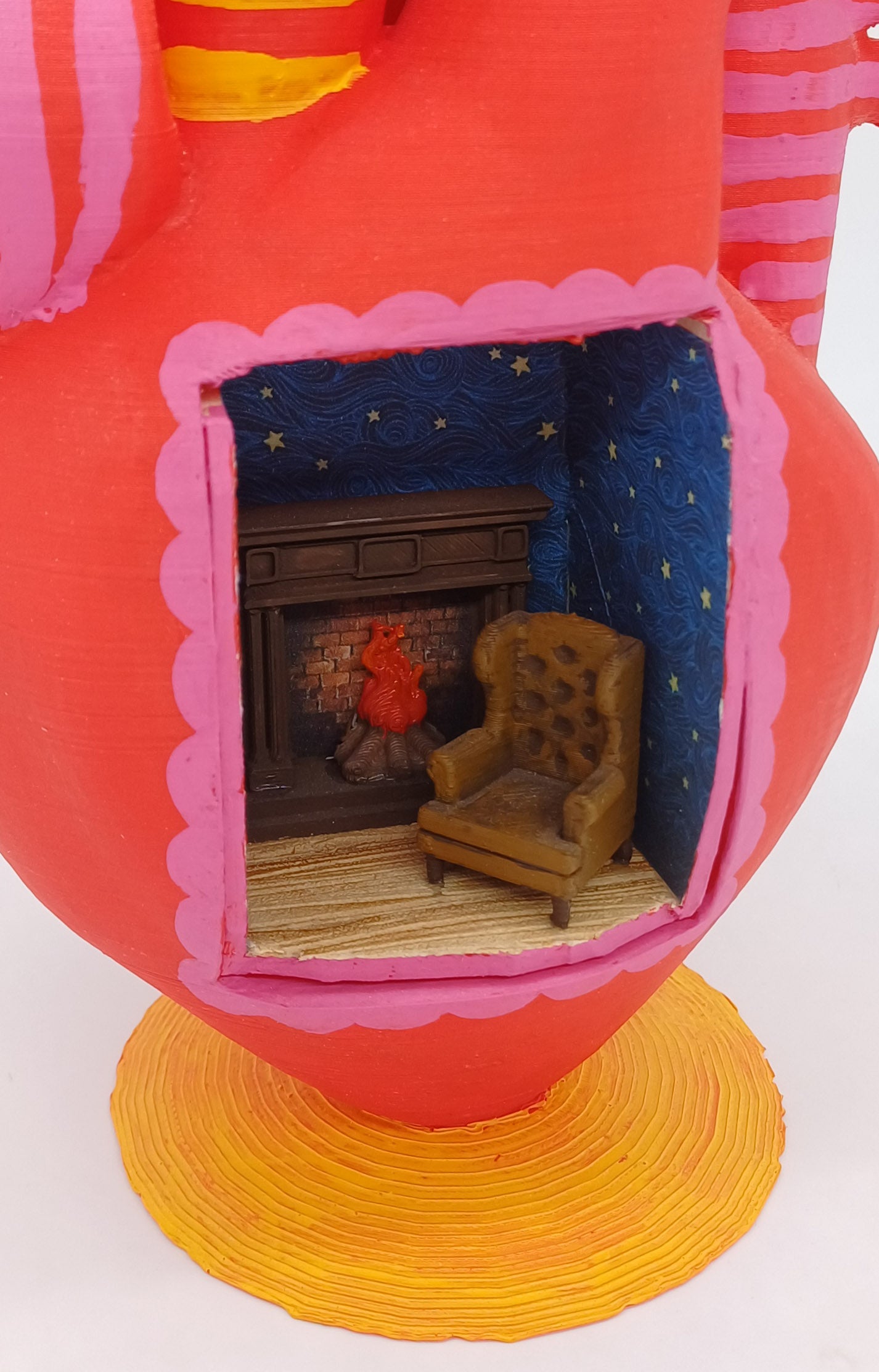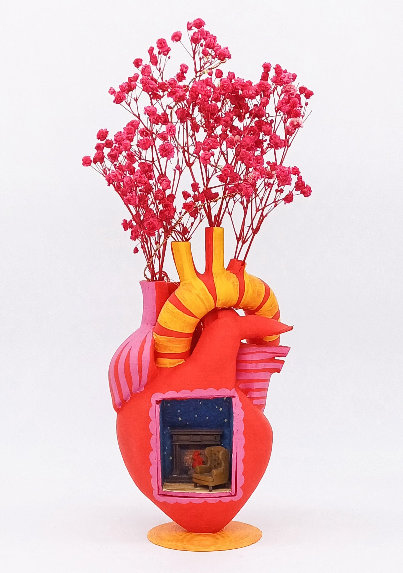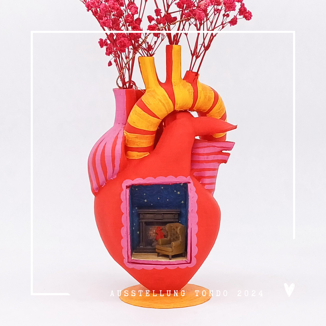 The artwork "Make yourself comfortable" impresses with its unique combination of sculpture and miniature installation. Shaped like an anatomical heart, the sculpture is brought to life with bold colors and vivid details. It is 33 x 15 cm in size and exudes a welcoming atmosphere with its warm colours of red, orange and yellow.