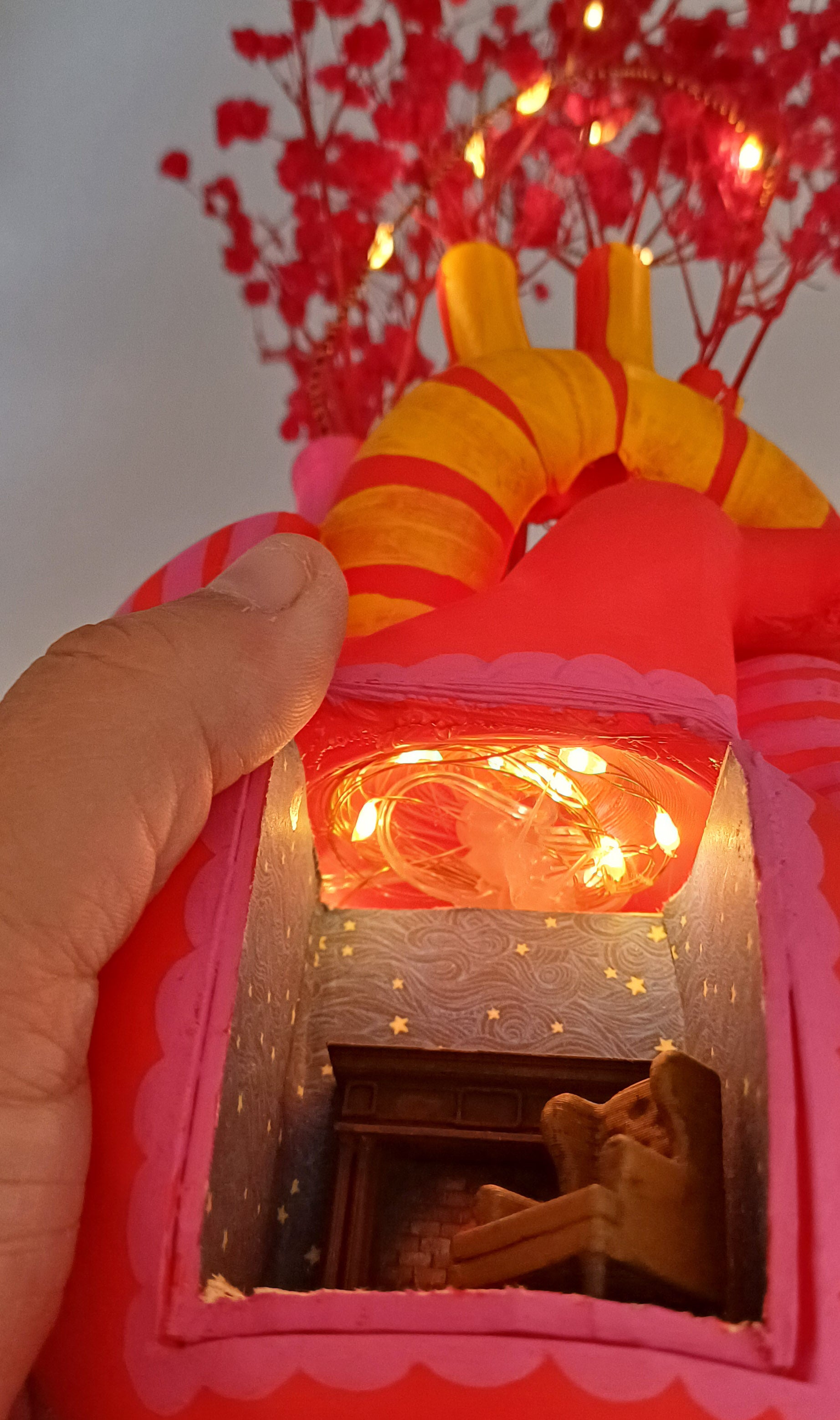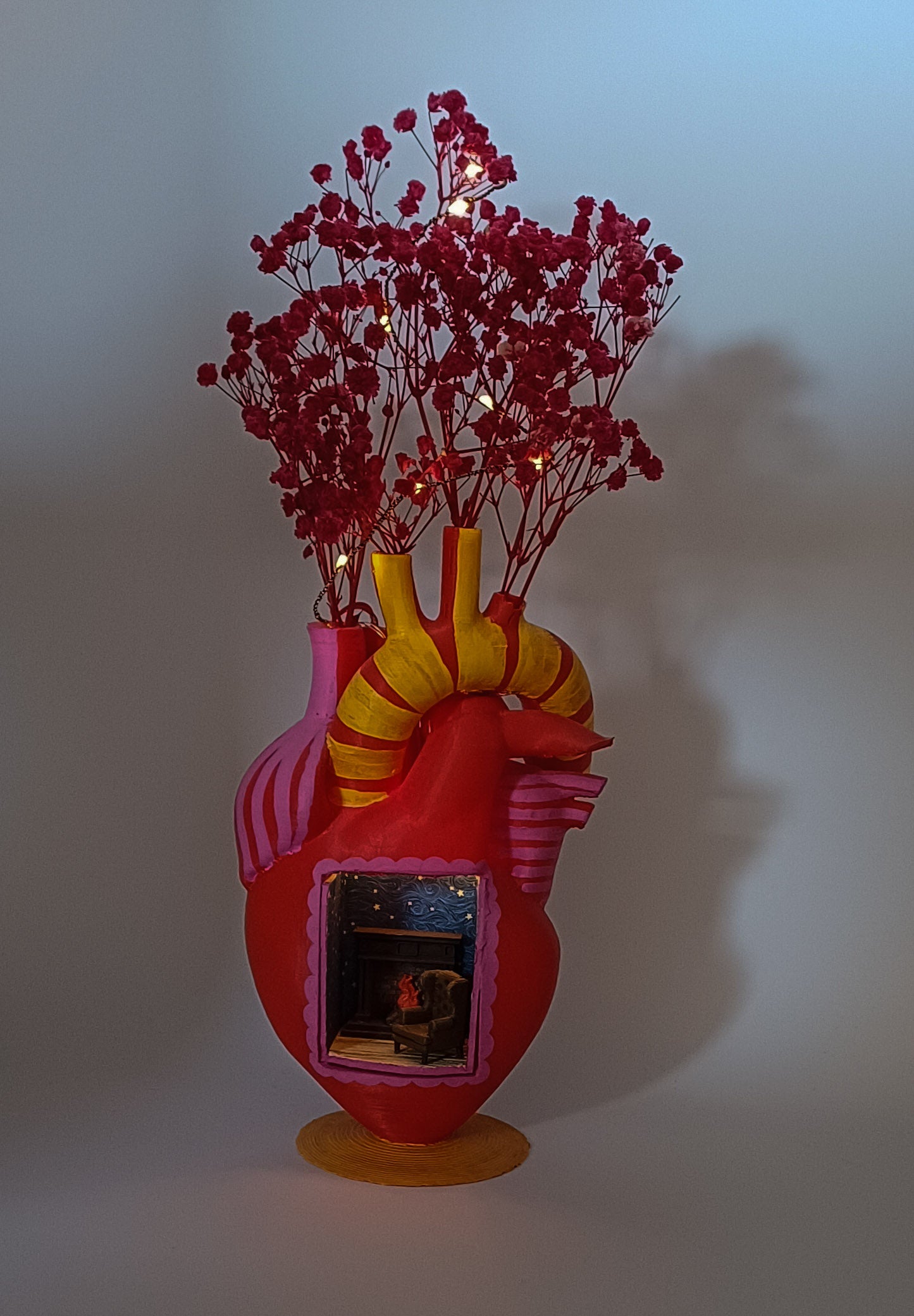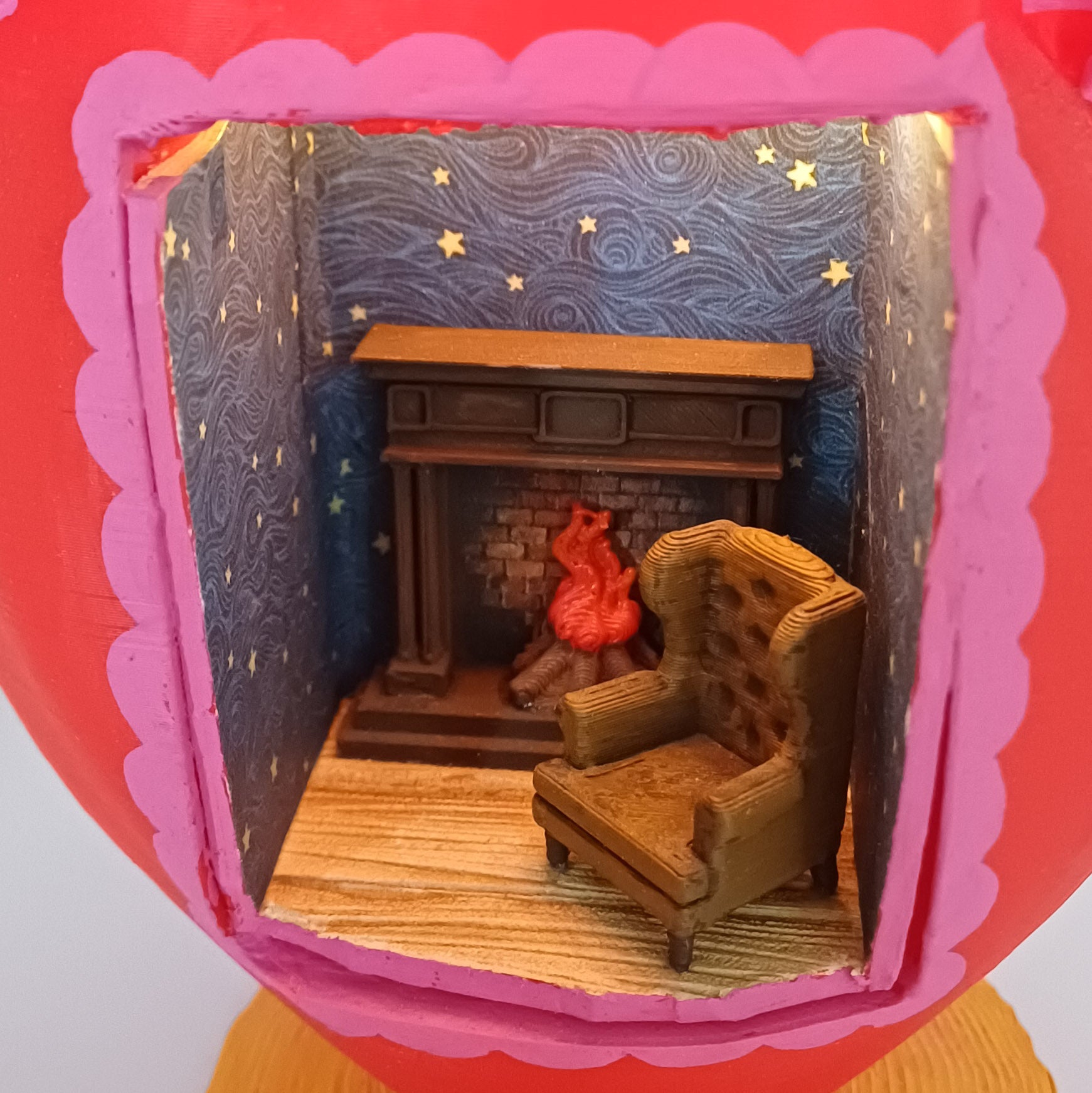 The integrated miniature world inside the heart is particularly fascinating: through a small window you can look into a cozy room that is reminiscent of a homely living room corner. An armchair and a fireplace, both carefully designed, convey a feeling of security and warmth. The installation is rounded off by atmospheric lighting inside, which illuminates the space and gives the artwork an additional dimension.