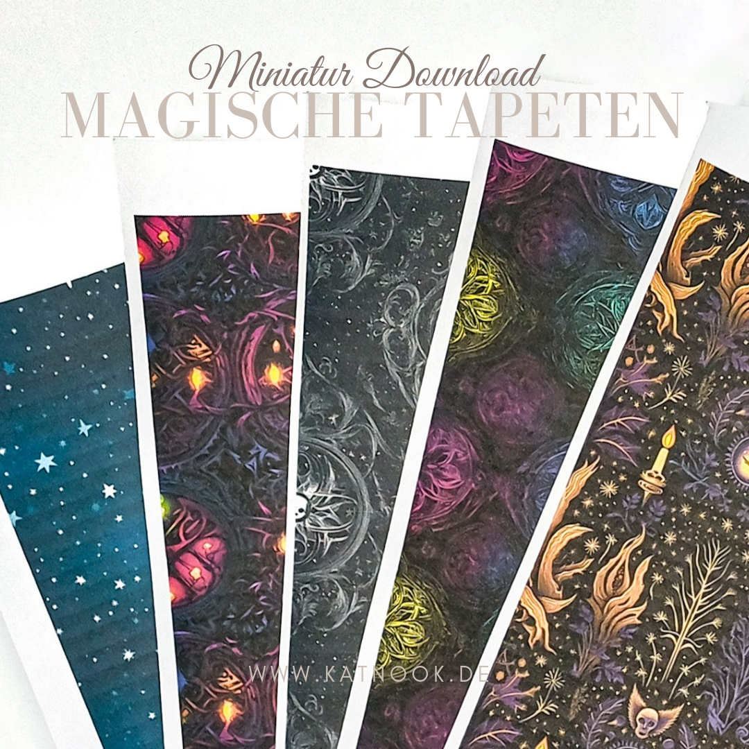 Mit diesem Download erhältst du fünf außergewöhnliche Tapetenmotive, die speziell für mein Miniaturprojekt „Magisches Antiquariat“ entworfen wurden. Sie eignen sich perfekt für Puppenhäuser und andere Miniaturwelten im Maßstab 1:12 und 1:6.