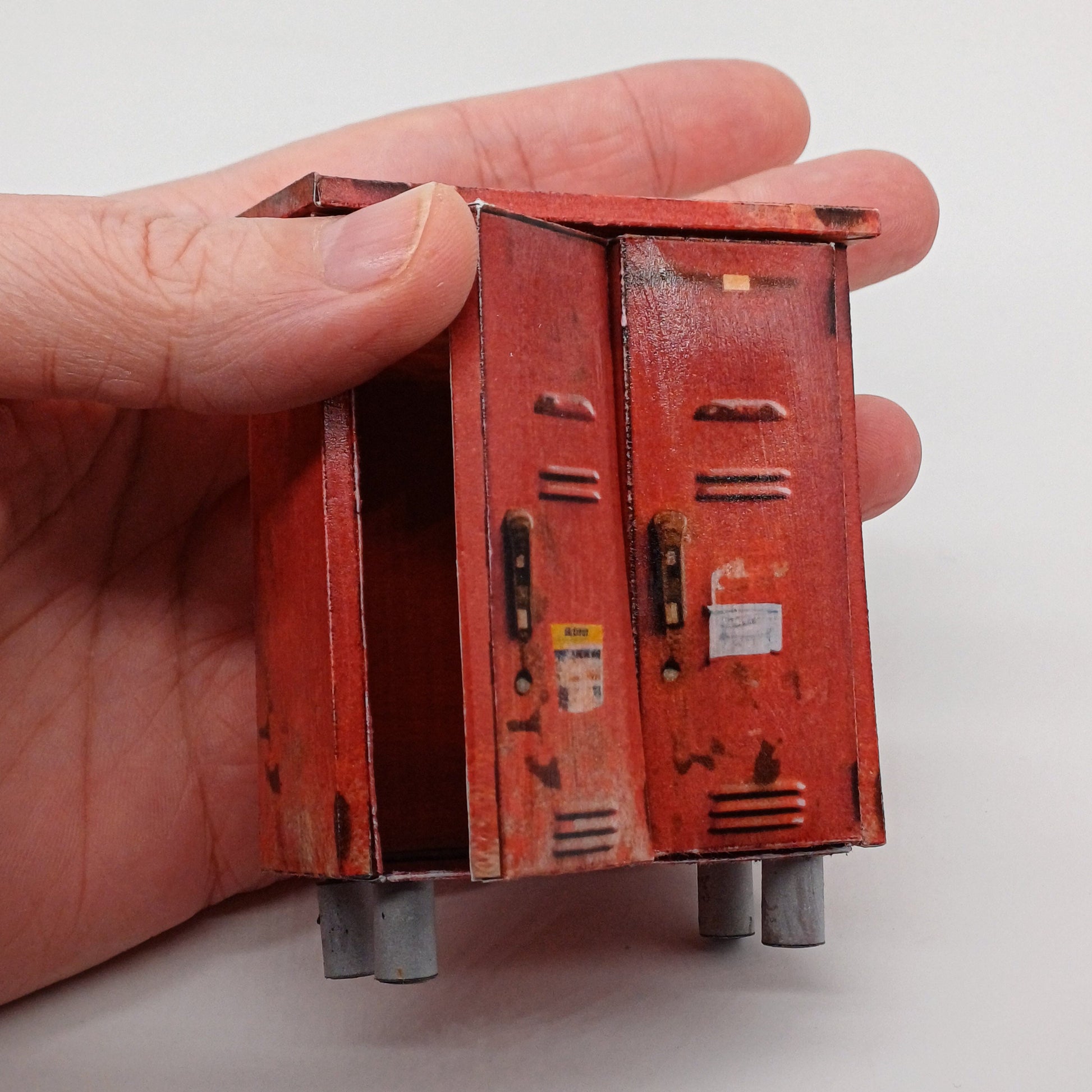 Mit der Druckdatei zum Basteln eines roten Spind-Schranks für Roombox Diorama, Puppenhaus oder Book Nook im Maßstab 1:12 (Druck auf 50% für Maßstab 1:24) wird dein Projekt zum Leben erweckt.