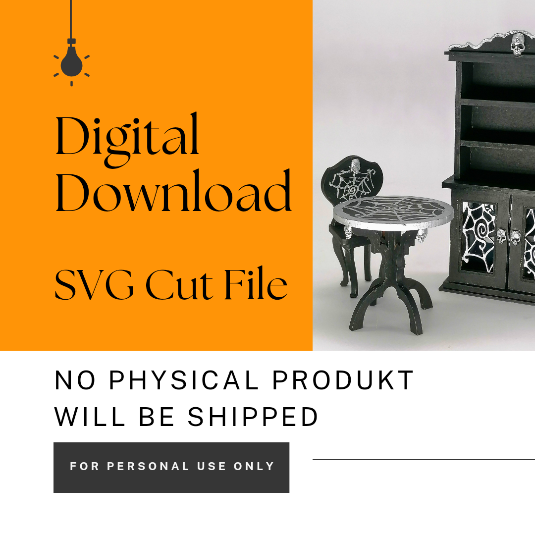 Erschaffe eine geheimnisvolle Atmosphäre in deinem Diorama, Puppenhaus oder Book Nook mit dieser einzigartigen SVG Lasercut-Datei für Hexenmöbel im Maßstab 1:12. Jedes Möbelstück ist kunstvoll mit Spinnenweben verziert, was ihnen einen eindrucksvollen und mystischen Charakter verleiht.