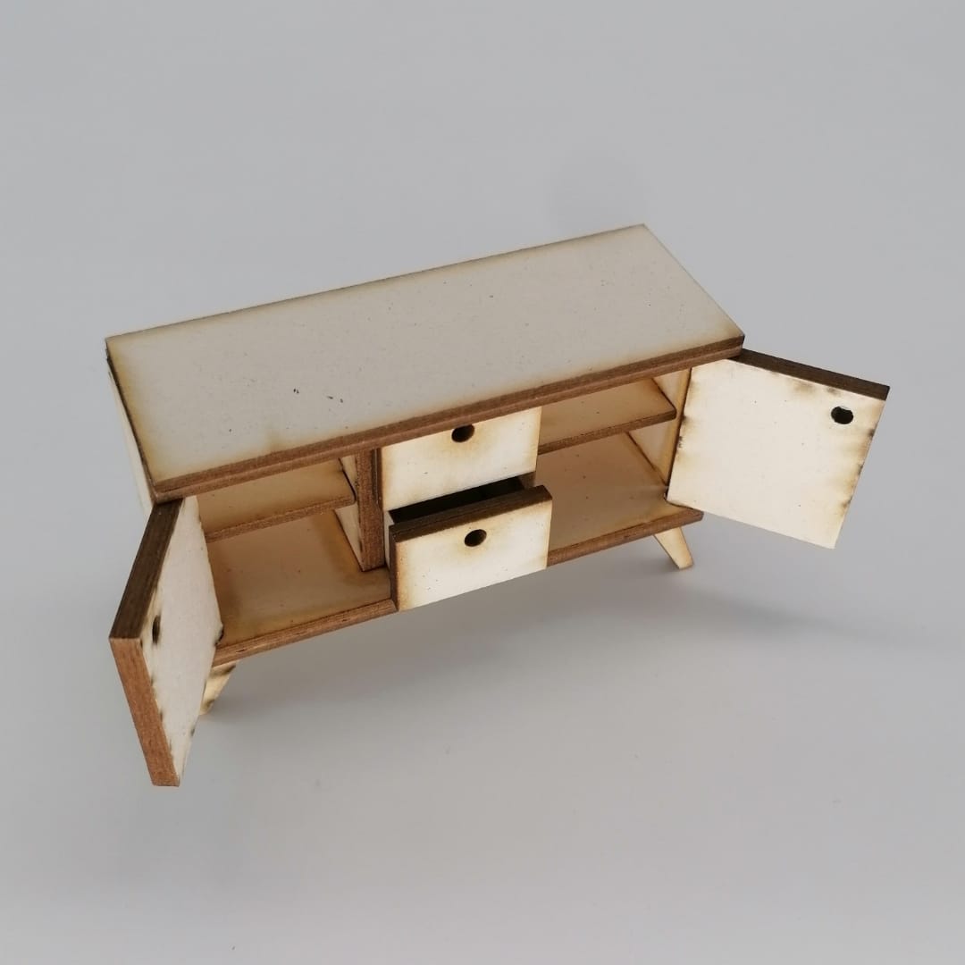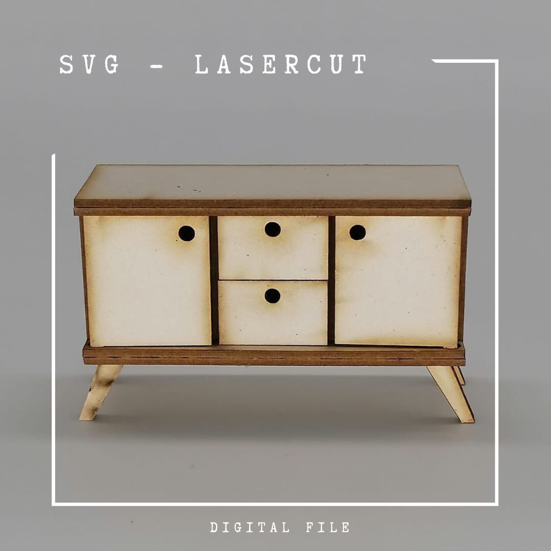 Verleihe Deiner Miniatur-Welt einen modernen Touch mit dieser digitalen SVG-Schnittdatei! Dieses Design wurde speziell für Lasercut-Maschinen entwickelt und ermöglicht es Dir, ein stilvolles Miniatur-Sideboard im Maßstab 1:12 zu erstellen. Mit seinen klaren Linien und praktischen Schubladen und Türen ist dieses Möbelstück ein echter Hingucker in jedem Puppenhaus oder Miniatur-Szenario.